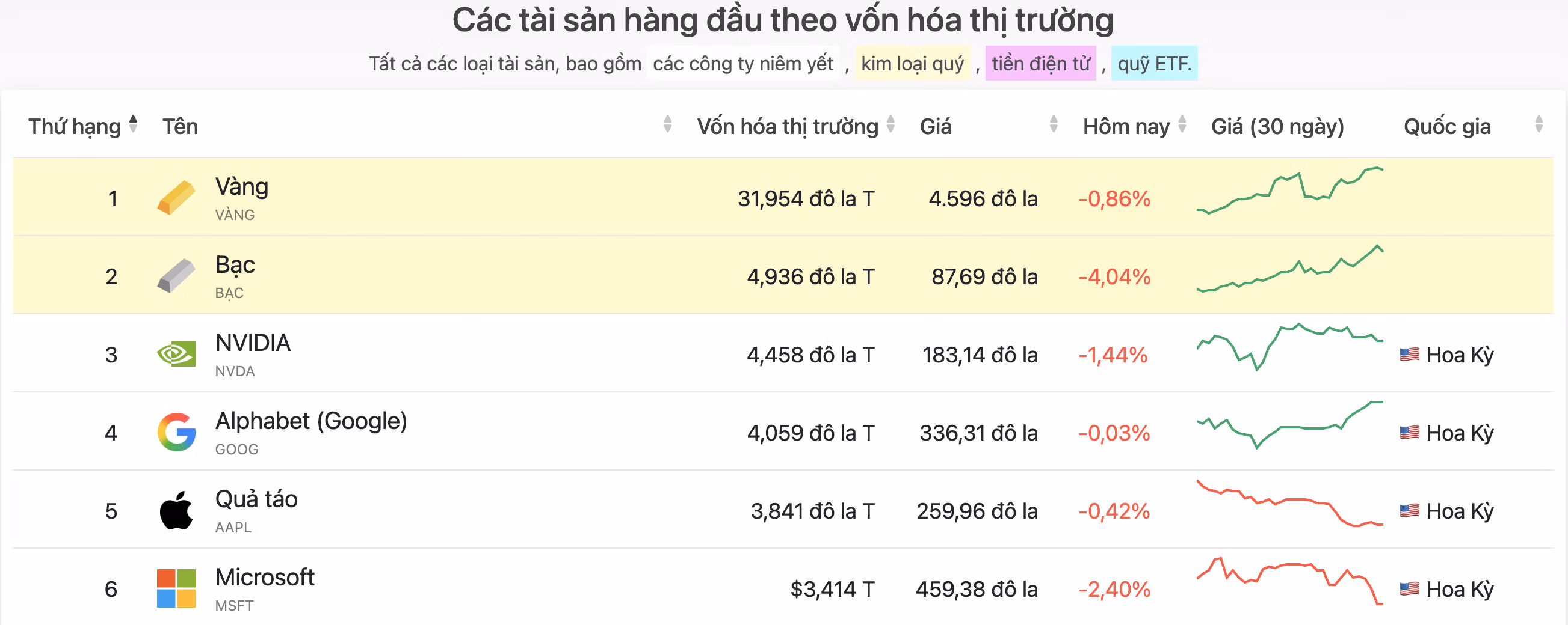 Theo dữ liệu từ CompaniesMarketCap, vàng hiện vẫn giữ vị trí số một với giá trị thị trường khoảng 31.954 tỷ USD. Trong khi đó, bạc có tổng giá trị vốn hóa gần 4.936 tỷ USD. Đây là con số kỷ lục trong lịch sử hơn hàng nghìn năm của bạc. Nhờ đó, kim loại quý này trở thành tài sản có giá trị lớn thứ hai toàn cầu, sau vàng.