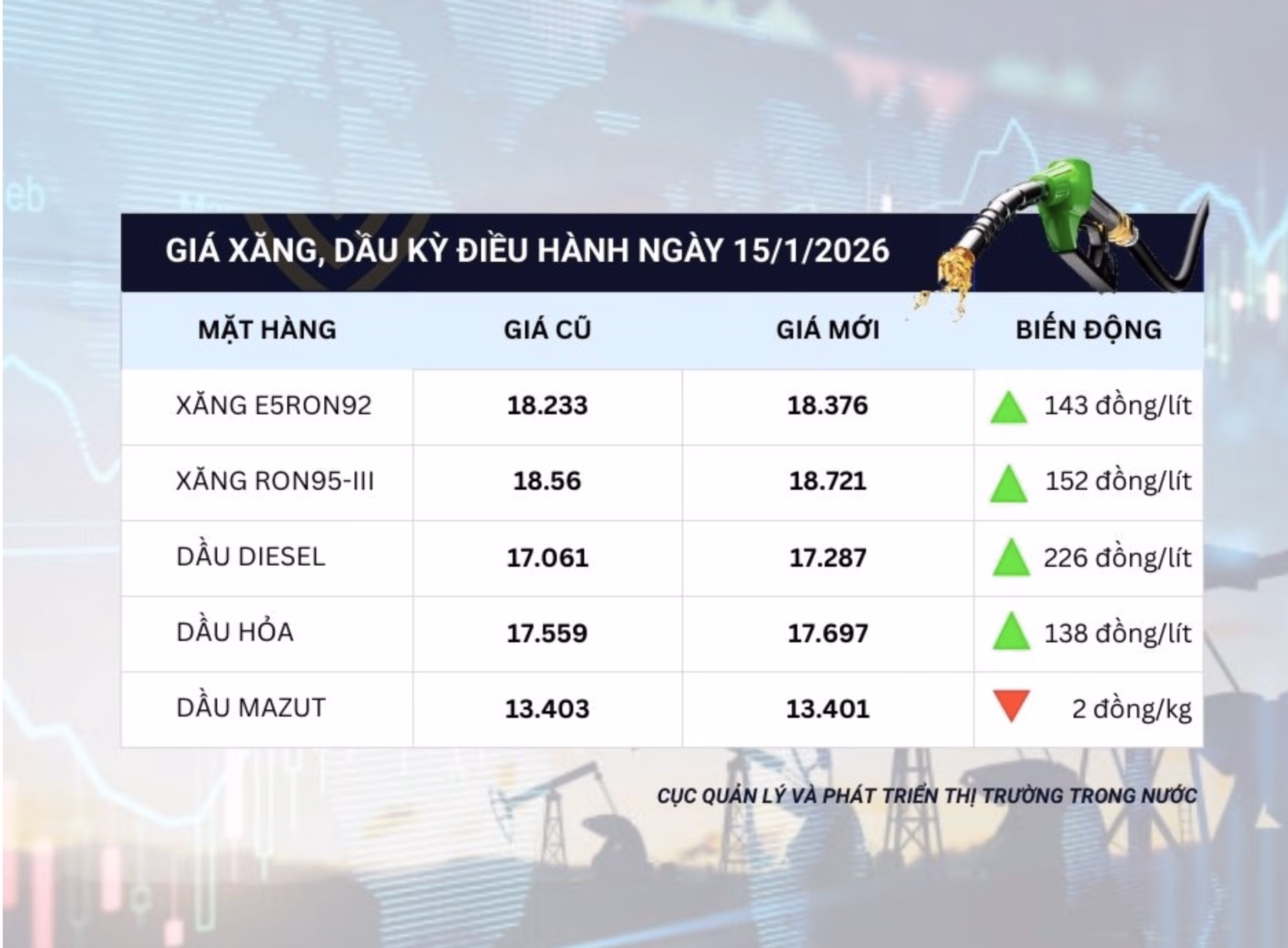 Cập nhật giá xăng dầu trong nước áp dụng từ ngày 15/01/2026