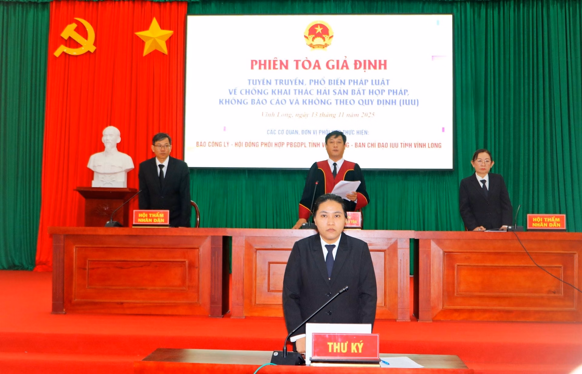 Sáng 13/11, tại Hội trường UBND xã Bình Đại (tỉnh Vĩnh Long), Báo Công lý chủ trì phối hợp với Hội đồng phối hợp PBGDPL tỉnh Vĩnh Long và Ban chỉ đạo IUU tỉnh Vĩnh Long tổ chức phiên tòa giả định tuyên truyền, phổ biến pháp luật chống khai thác hải sản bất hợp pháp, không báo cáo, không theo quy định (IUU).