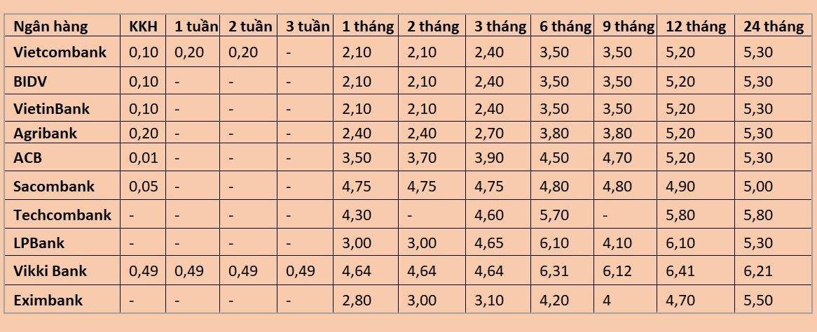 Trong khi đó, các ngân hàng thương mại cổ phần cho thấy mức lãi suất cạnh tranh hơn. ACB niêm yết 4,50%/năm cho kỳ hạn 6 tháng và 4,70%/năm cho kỳ hạn 9 tháng. Sacombank giữ mức ổn định quanh 4,75-4,80%/năm ở các kỳ hạn từ 1 đến 9 tháng.